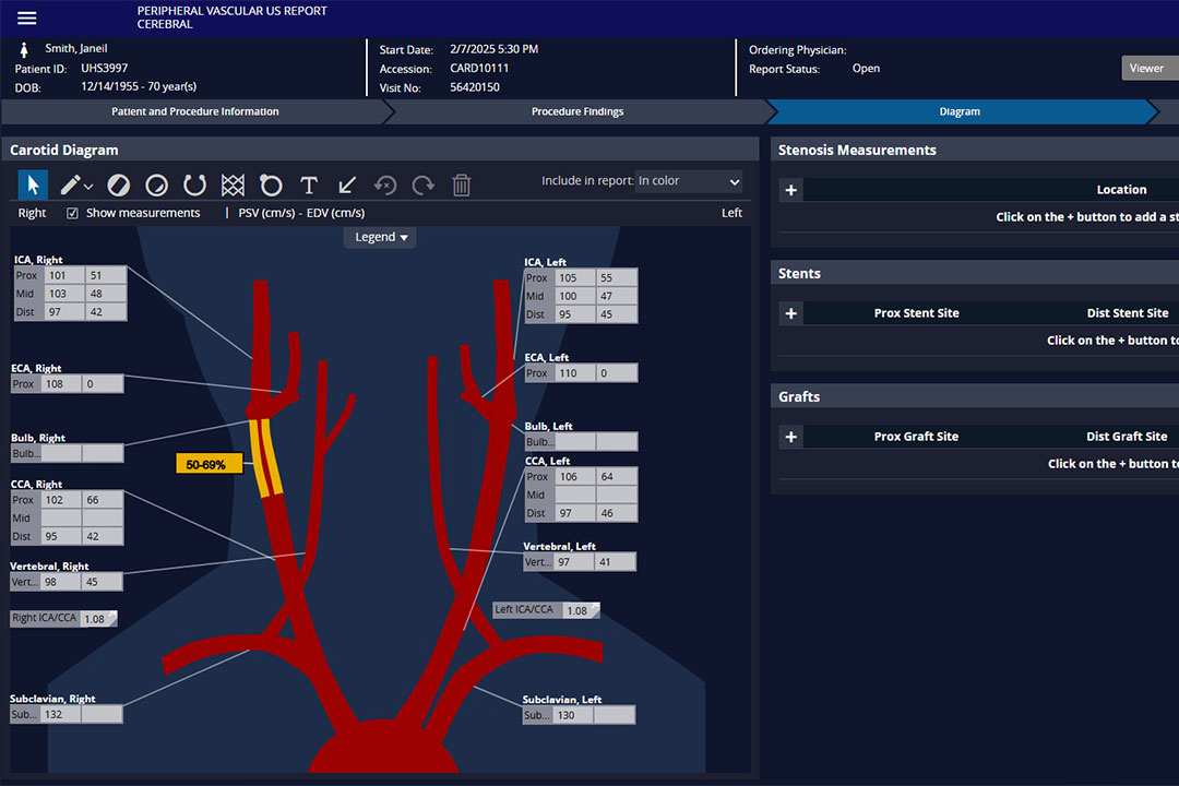 The vascular ultrasound software tools required to view and reanalyze images, import values, reanalyze measurements, annotate and complete anatomical diagrams, and generate and sign electronic reports are available from a single platform.